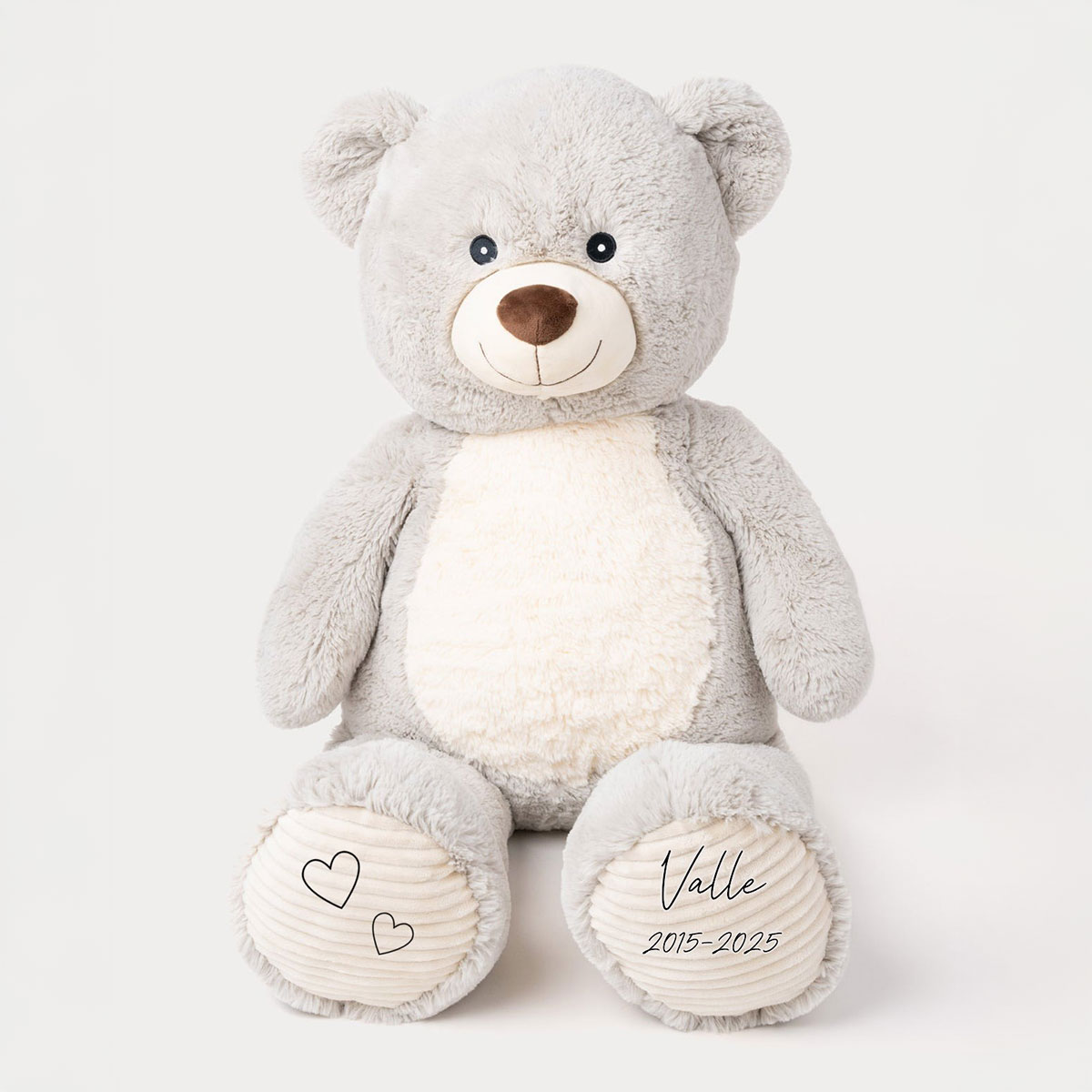 Valle kan göras personlig med dekor på magen eller på höger eller vänster tass, som namn, datum eller en liten symbol. Det gör honom till ett unikt minne att bevara – eller en omtänksam gåva till någon som behöver extra mycket värme och närhet.