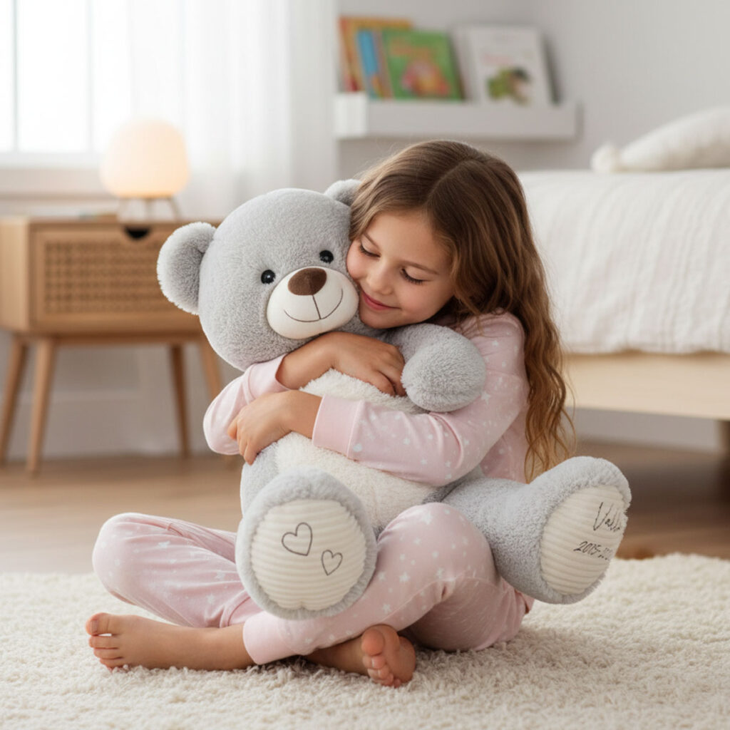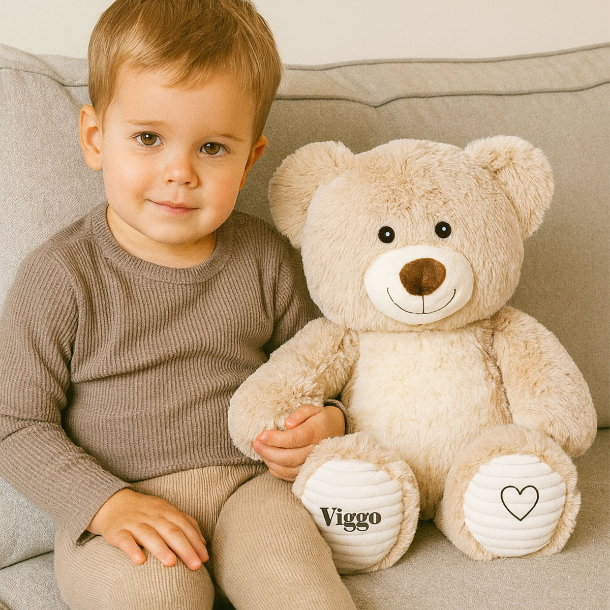 Den generösa storleken på 45 cm gör att Viggo är precis lagom stor att krama, vila huvudet mot eller ha nära i sängen eller soffan. Nallen förmedlar lugn, värme och omtanke – ett mjukt stöd när känslorna behöver få ta plats.